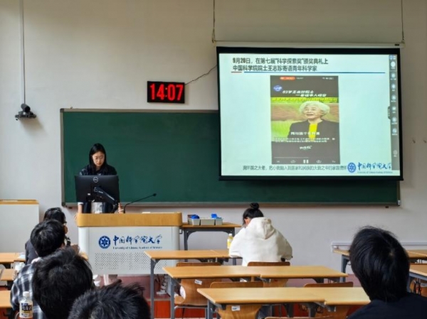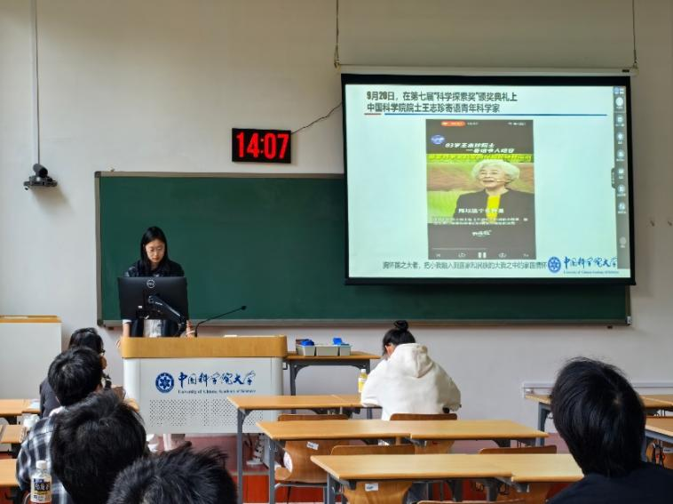 破冰环节结束后,郭子涵、吴文慧两位同学分别分享中国科学院优秀科学家事迹,以榜样力量点亮科研初心。郭子涵以中国科学院院士王志珍为例,重点讲述其83岁在第七届“科学探索奖”颁奖典礼上的寄语—“胸怀国之大者,把小我融入到国家和民族的大我之中”,不仅彰显了老一辈科研工作者深沉的家国情怀,更为新时代青年科研人指明了方向—以学术追求服务国家需求,以个人理想托举民族未来。